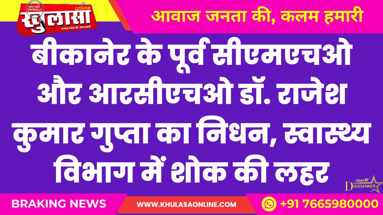 खुलासा न्यूज़, बीकानेर। बीकानेर स्वास्थ्य विभाग से जुड़ी एक अत्यंत दुखद खबर सामने आई है। जिला प्रजनन एवं शिशु स्वास्थ्य अधिकारी (आरसीएचओ) बीकानेर तथा पूर्व मुख्य चिकित्सा एवं स्वास्थ्य अधिकारी (सीएमएचओ) डॉ. राजेश कुमार गुप्ता का आज प्रातः हृदयघात से आकस्मिक निधन हो गया। उनके निधन की सूचना मिलते ही संपूर्ण चिकित्सा जगत, स्वास्थ्य विभाग और बीकानेर जिले में शोक की लहर दौड़ गई। डॉ. राजेश कुमार गुप्ता ने अपने लंबे सेवाकाल के दौरान मातृ एवं शिशु स्वास्थ्य सेवाओं को सुदृढ़ करने में महत्वपूर्ण भूमिका निभाई। स्वास्थ्य विभाग के अधिकारियों और उनके सहयोगियों ने बताया कि वे एक समर्पित, कर्मठ और संवेदनशील अधिकारी थे, जिनके मार्गदर्शन में कई जनकल्याणकारी योजनाओं का सफल क्रियान्वयन हुआ।
