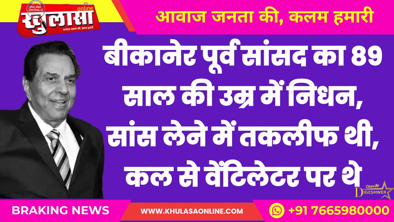 बीकानेर पूर्व सांसद का 89 साल की उम्र में निधन, सांस लेने में तकलीफ थी, कल से वेंटिलेटर पर थे