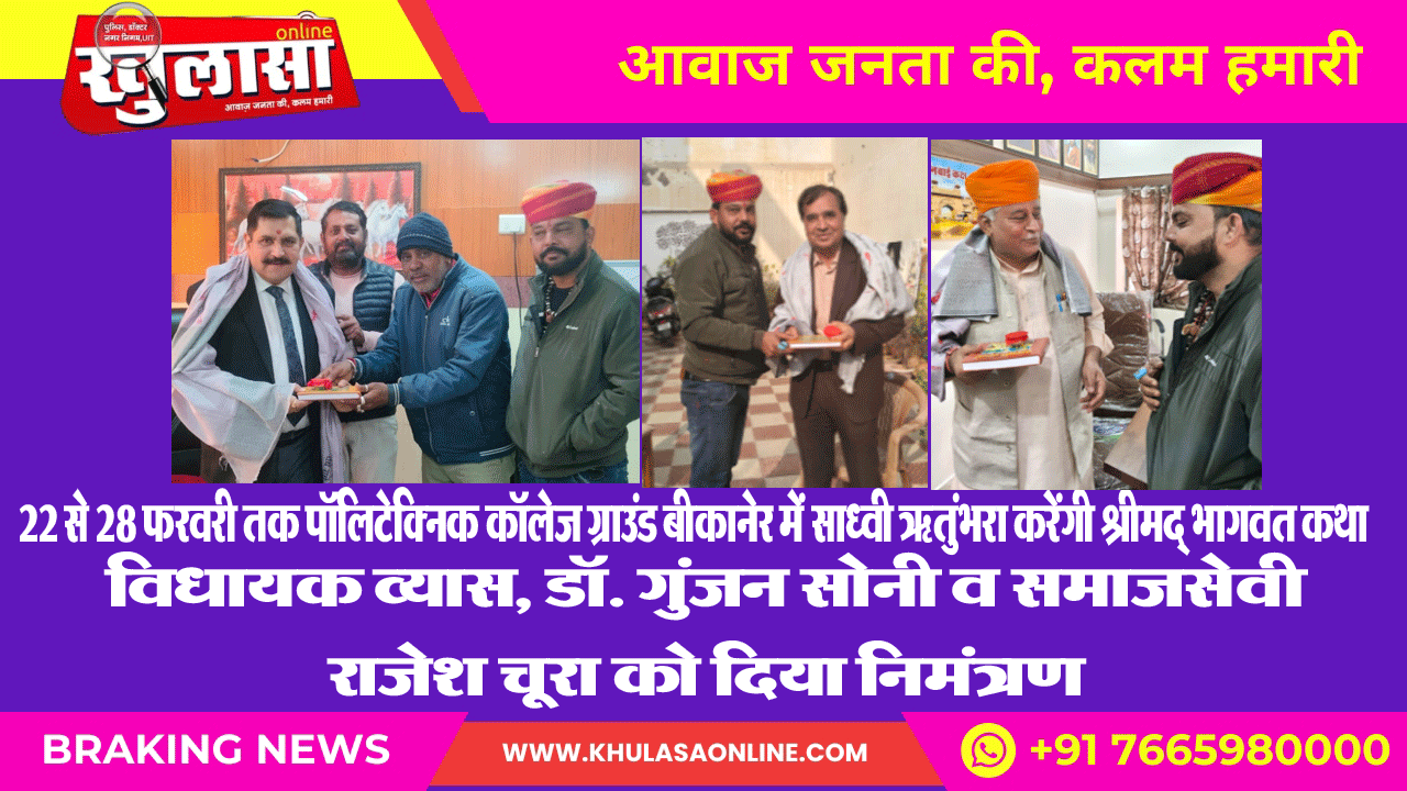 22 से 28 फरवरी तक पॉलिटेक्निक कॉलेज ग्राउंड बीकानेर में साध्वी ऋतुंभरा करेंगी श्रीमद् भागवत कथा विधायक जेठानंद व्यास मेडिकल कालेज के पूर्व प्रिंसिपल डॉ गुंजन सोनी और समाजसेवी राजेश चूरा को दिया निमंत्रण