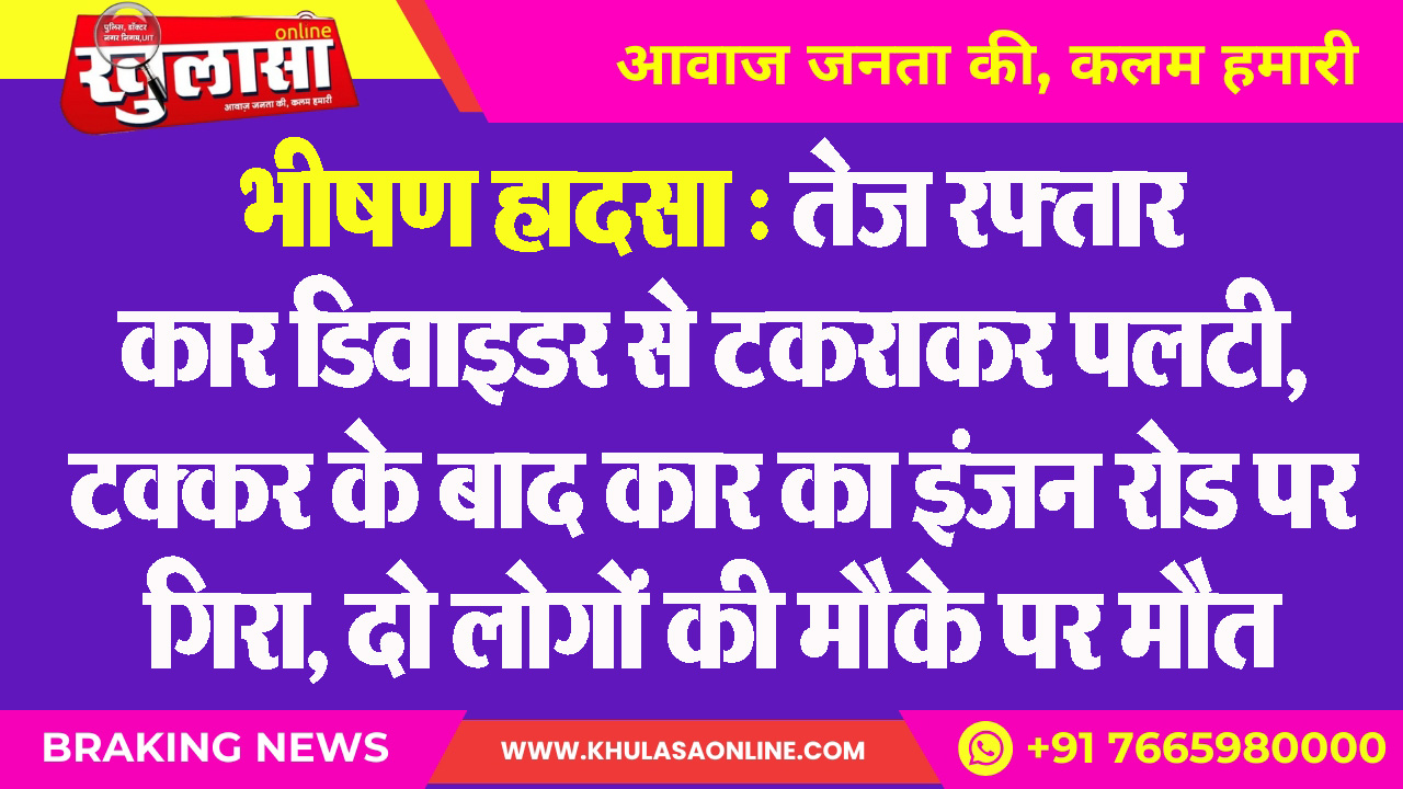भीषण हादसा : तेज रफ्तार कार डिवाइडर से टकराकर पलटी, टक्कर के बाद कार का इंजन रोड पर गिरा, दो लोगों की मौके पर मौत