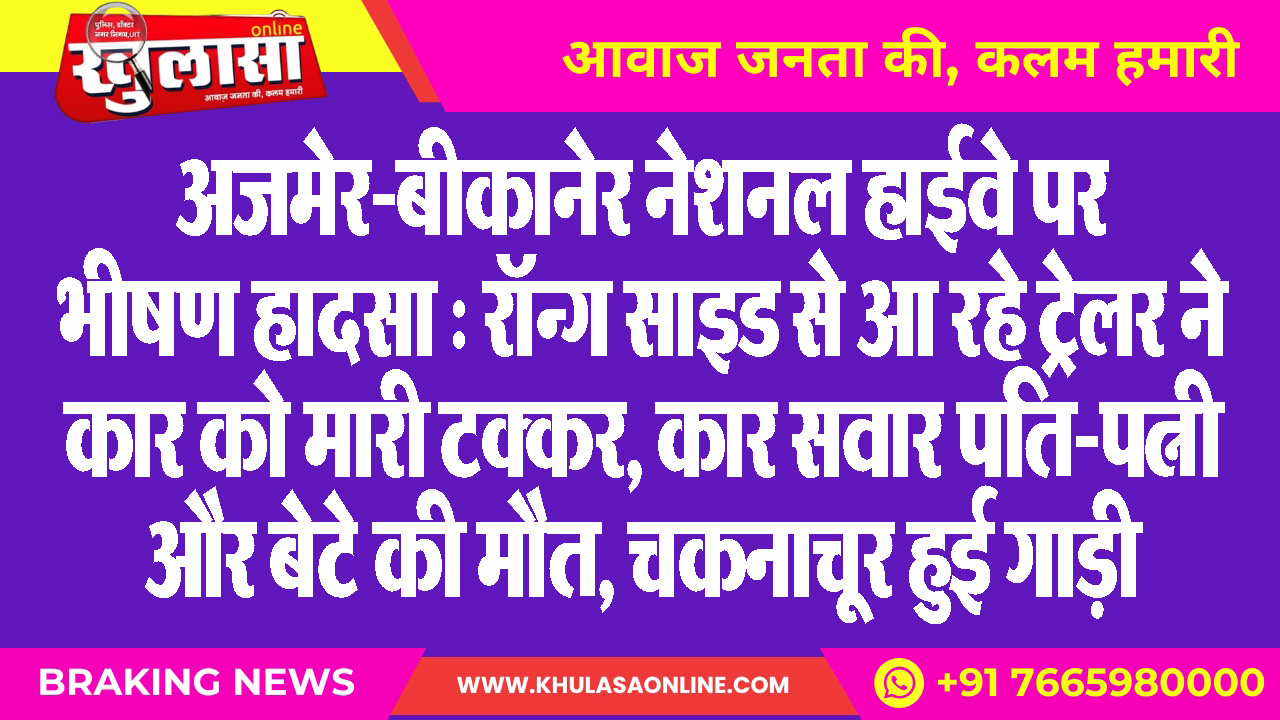 अजमेर-बीकानेर नेशनल हाईवे पर भीषण हादसा : रॉन्ग साइड से आ रहे ट्रेलर ने कार को मारी टक्कर, कार सवार पति-पत्नी और बेटे की मौत, चकनाचूर हुई गाड़ी