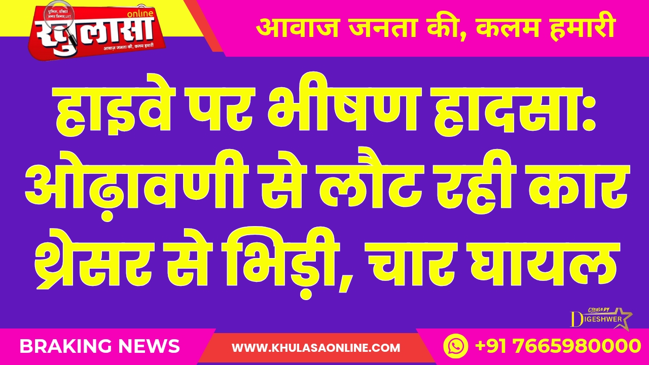 हाइवे पर भीषण हादसा: ओढ़ावणी से लौट रही कार थ्रेसर से भिड़ी, चार घायल
