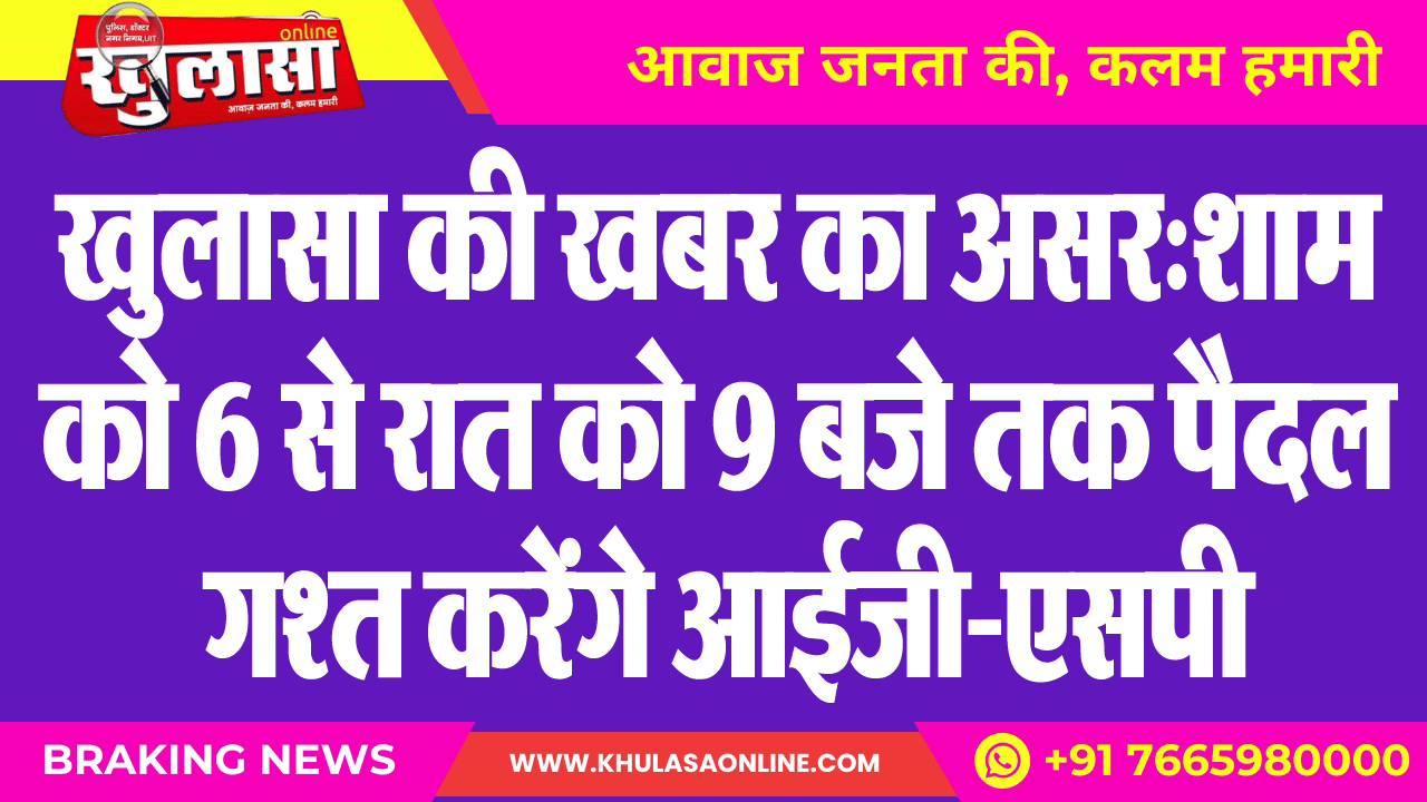 शहर में बढ़ रहे अपराधों को लेकर खुलासा ने एसपी साहब बाहर निकालिए और रात को गश्त कर हालात देखिए खबर चलाई थी। अब पूरे प्रदेश में ही निर्देश दिए गए. इसके तहत शाम 6 से रात 9 बजे तक आईजी और एसपी पैदल गश्त करेंगे।