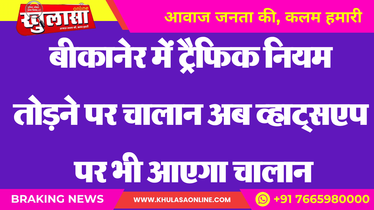 बीकानेर। ट्रैफिक नियम तोडऩे पर चालान अब केवल एसएमएस या ई-मेल से ही नहीं, बल्कि व्हाट्सएप पर भी भेजा जाएगा। राज्य सरकार ने इस संबंध में अधिसूचना जारी कर दी है। बीकानेर जैसे शहर में, जहां प्रतिदिन 400 से 500 चालान ट्रैफिक पुलिस और परिवहन विभाग की ओर से किए जाते हैं, वहां यह व्यवस्था वाहन मालिकों के लिए बड़ी राहत साबित होगी।