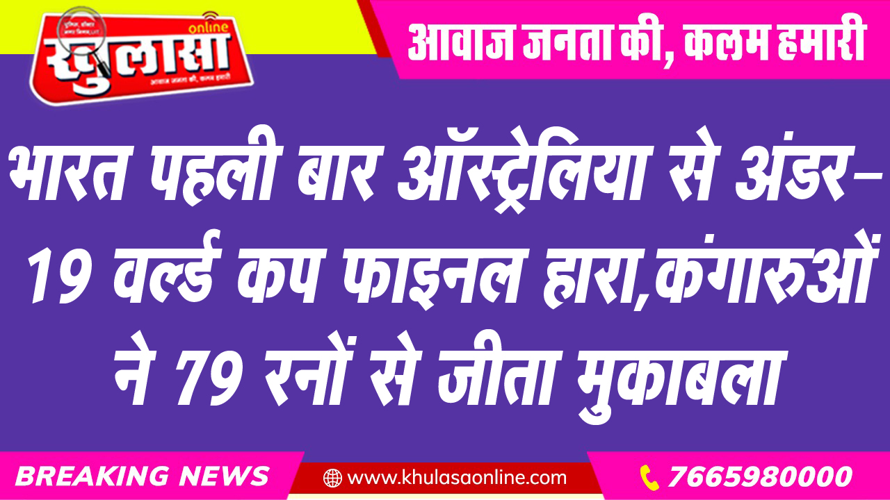 खुलासा न्यूज, नेटवर्क। भारतीय जूनियर टीम का अंडर-19 वर्ल्ड चैंपियन बनने का सपना टूट गया है। अंडर-19 वर्ल्ड कप के फाइनल मुकाबले में ऑस्ट्रेलिया ने भारत को 79 रन से हराया। कंगारुओं ने इस टूर्नामेंट के फाइनल में भारत को पहली बार हराया है। ऑस्ट्रेलियन ने चौथा टाइटल जीता है। इससे पहले टीम 2010 में पाकिस्तान को 25 रन से हराकर चैंपियन बनी थी। बेनोनी में रविवार को 254 रन का टारगेट चेज कर रही भारतीय टीम 43.5 ओवर में 174 रन पर ऑलआउट हो गई। ओपनर आदर्श सिंह ने सबसे ज्यादा 47 रन बनाए। कंगारुओं की ओर से रफ मैकमिलन और माहली बीयर्डमैन ने 3-3 विकेट झटके। इससे पहले, कंगारू टीम ने टॉस जीतकर बल्लेबाजी करते हुए 50 ओवर में 7 विकेट पर 253 रन बनाए। हरजस सिंह ने सबसे ज्यादा 55 रन बनाए। जबकि कप्तान ह्यूज वीबजेन 48 और हैरी डिक्सन 42 रन बनाकर आउट हुए। राज लिम्बानी को 3 विकेट मिले। जबकि नमन तिवारी को 2 सफलताएं मिलीं।