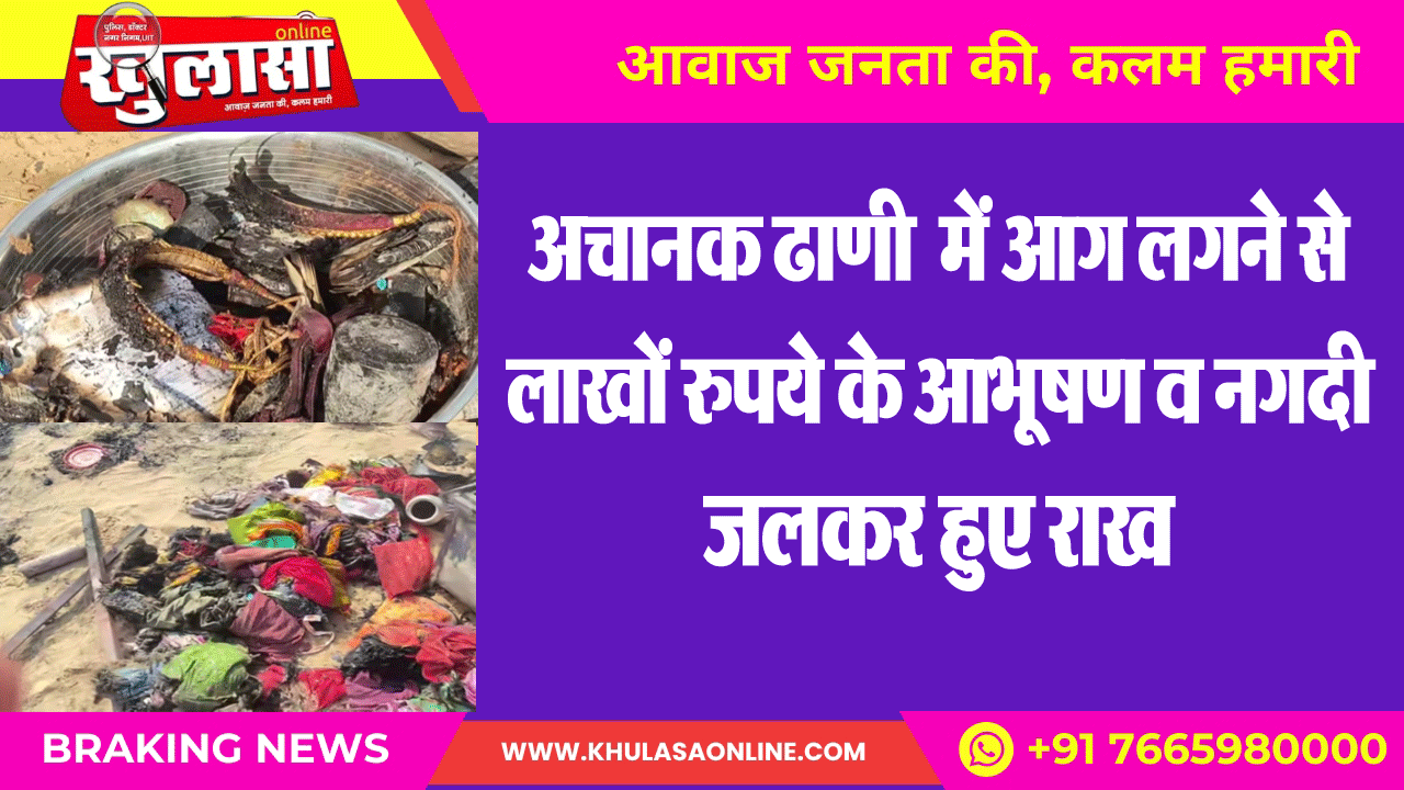 अचानक ढाणी में आग लगने से लाखों रुपये के आभूषण व नगदी जलकर हुए राख