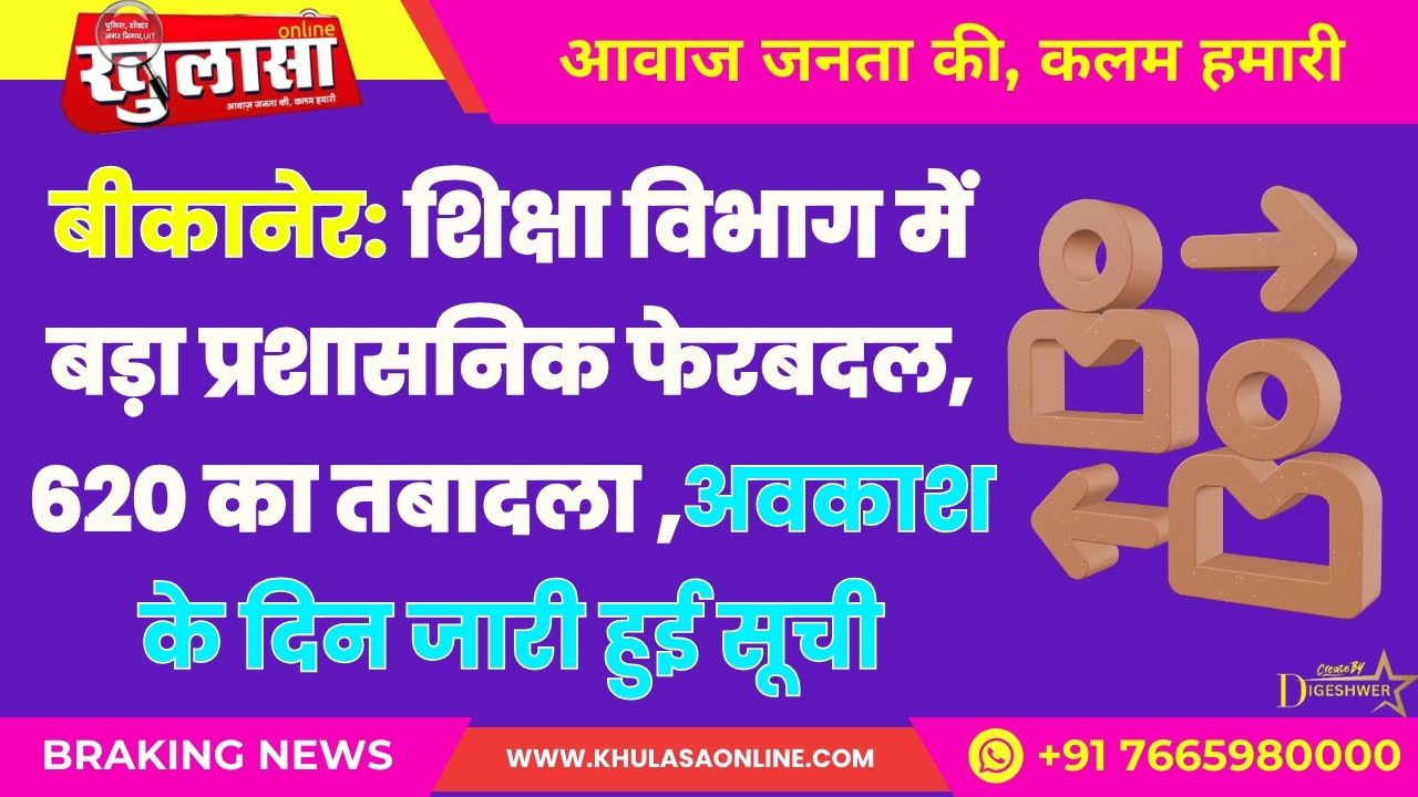 बीकानेर: शिक्षा विभाग में बड़ा प्रशासनिक फेरबदल, 620 का तबादला ,अवकाश के दिन जारी हुई सूची