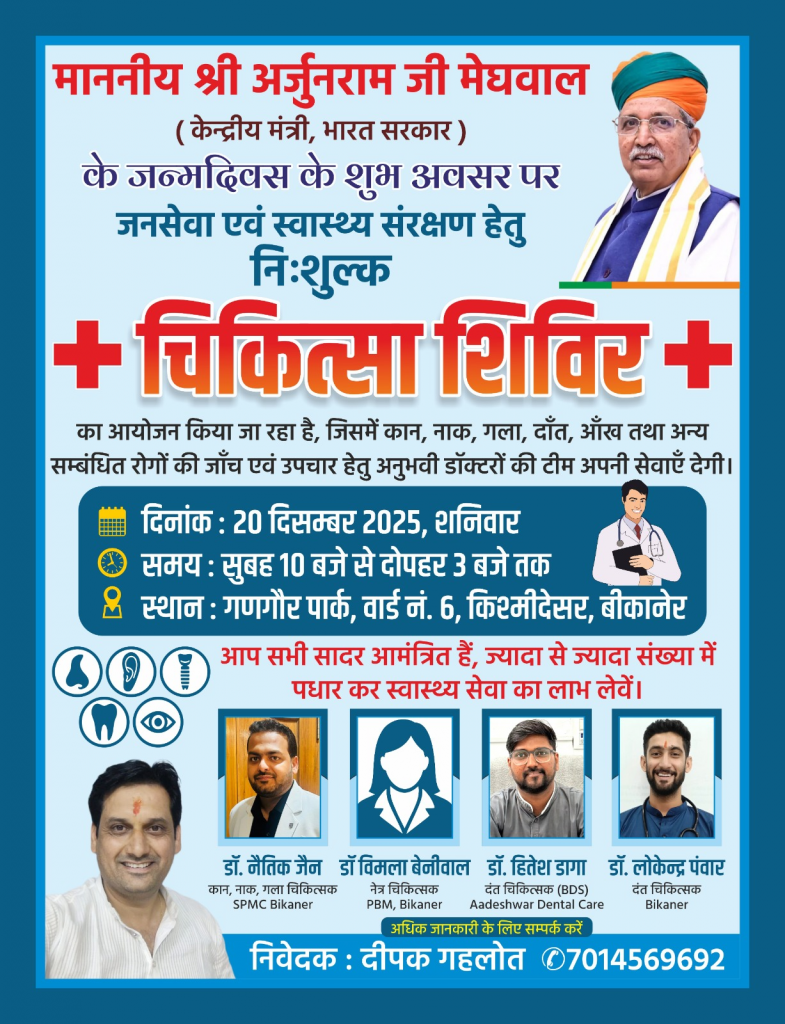 खुलासा न्यूज़, बीकानेर। केंद्रीय मंत्री अर्जुन मेघवाल के जन्मदिन के अवसर पर 20 दिसंबर को उनके पैतृक गृह क्षेत्र किसमीदेसर में निःशुल्क मेडिकल कैंप का आयोजन किया जाएगा। इस कैंप की तैयारियां भाजपा वार्ड नंबर 6 के पार्षद प्रत्याशी रहे दीपक गहलोत की अगुवाई में शुरू कर दी गई हैं। आयोजित मेडिकल कैंप में आंख, नाक, कान, गला, दांत सहित विभिन्न रोगों की जांच व उपचार की सुविधा उपलब्ध कराई जाएगी। इसके लिए अनुभवी डॉक्टरों की टीम अपनी सेवाएं देगी।