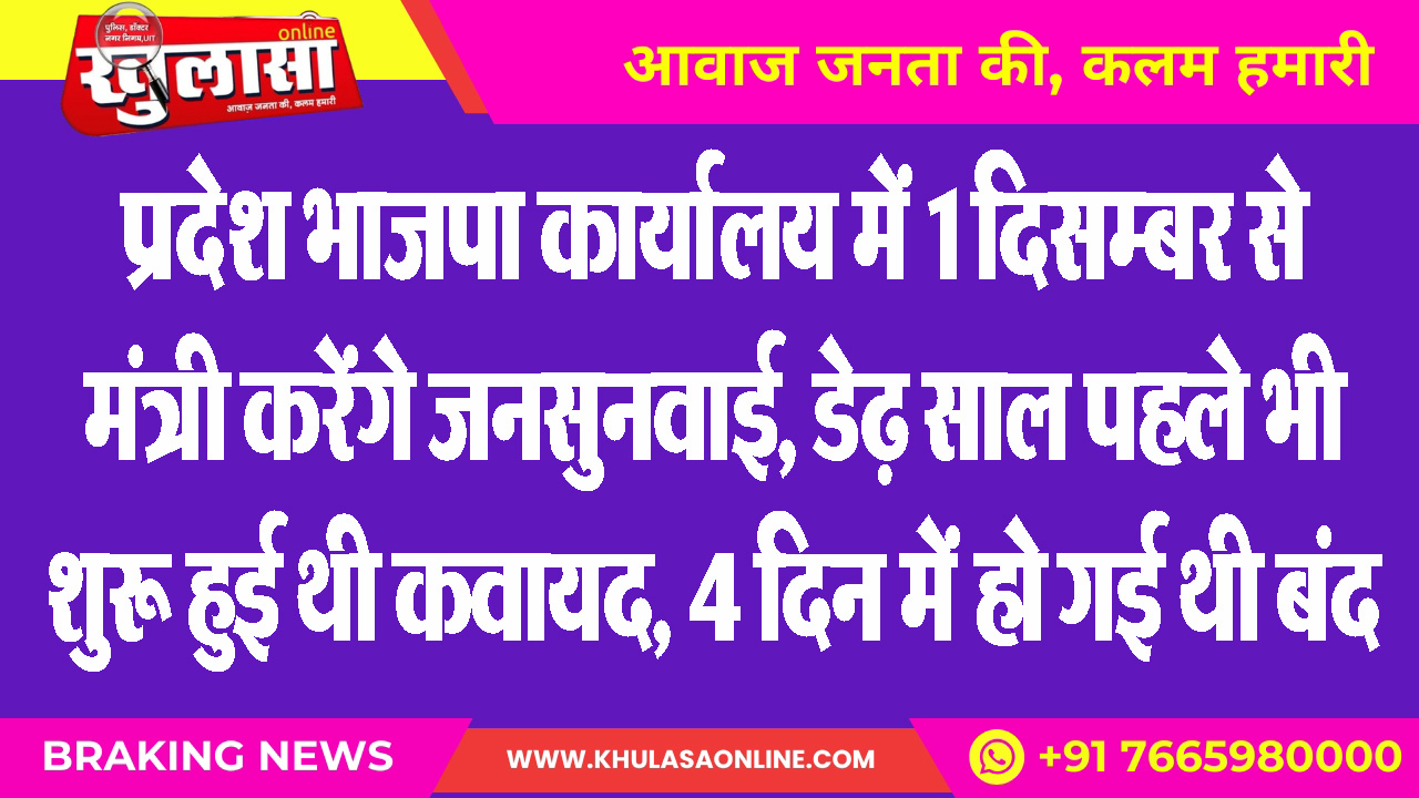 प्रदेश भाजपा कार्यालय में 1 दिसम्बर से मंत्री करेंगे जनसुनवाई, डेढ़ साल पहले भी शुरू हुई थी कवायद, 4 दिन में हो गई थी बंद