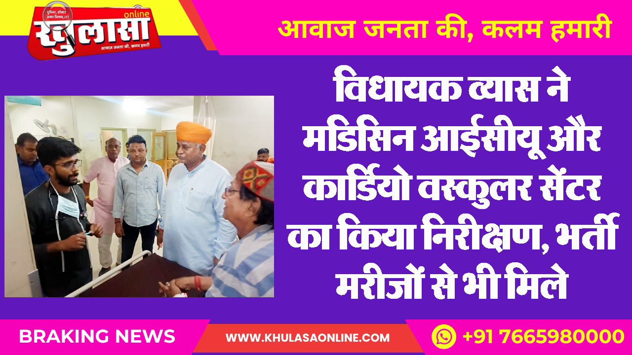 विधायक व्यास ने मडिसिन आईसीयू और कार्डियो वस्कुलर सेंटर का किया निरीक्षण, भर्ती मरीजों से भी मिले