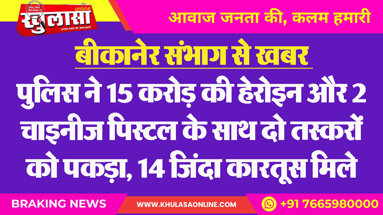 बीकानेर संभाग से खबर : पुलिस ने 15 करोड़ की हेरोइन और 2 चाइनीज पिस्टल के साथ दो तस्करों को पकड़ा, 14 जिंदा कारतूस मिले