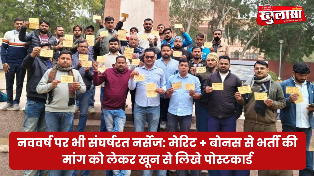 नववर्ष पर भी संघर्षरत नर्सेज: मेरिट + बोनस से भर्ती की मांग को लेकर खून से लिखे पोस्टकार्ड