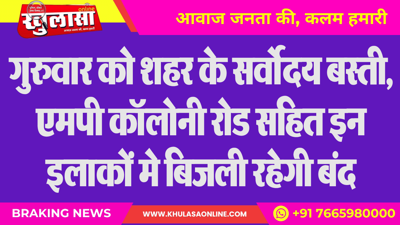 गुरुवार को शहर के सर्वोदय बस्ती, एमपी कॉलोनी रोड सहित इन इलाकों मे बिजली रहेगी बंद