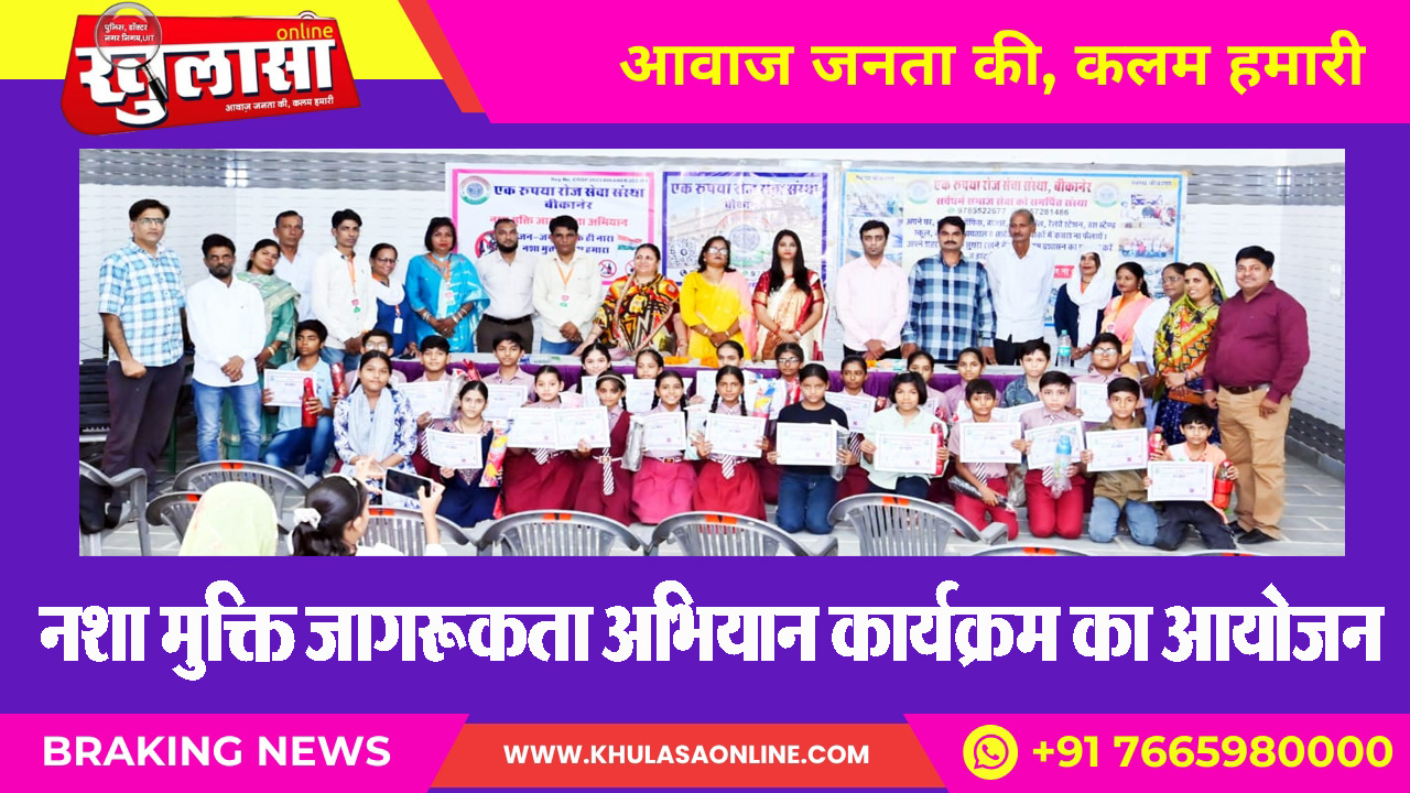 बीकानेर। एक रुपया रोज सेवा संस्था के द्वारा चोखूँटी स्थित कुम्हार सभा भवन में नशा मुक्ति जागरूकता कार्यक्रम का आयोजन किया गया। कार्यक्रम में विभिन्न स्कूलों के छात्र-छात्राओ की प्रतियोगिता का आयोजन किया गया जिसमें प्रथम द्वितीय और तृतीय स्थान पर रहने वाले बच्चों को मोमेंटो सर्टिफिकेट और चांदी का गिफ्ट देकर सम्मानित किया गया साथ ही भाग लेने वाले सभी बच्चों को प्रशस्ति पत्र व गिफ्ट दिए गए।