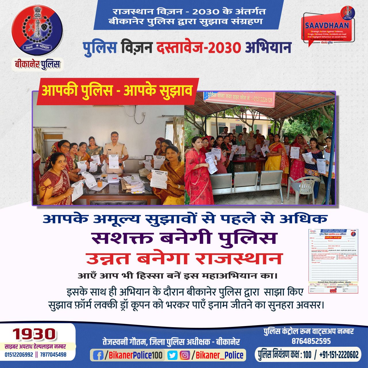खुलासा न्यूज, बीकानेर। बीकानेर की पुलिस ने ”पुलिस विजय डॉक्यूमेंट 2030” अभियान के तहत आम जन एवं सभी स्टॉक होल्डर्स से पुलिस को बेहतर बनाने के लिए सुझाव मांगे गए है। ये सुझाव पुलिस द्वारा जारी फॉर्म या गूगल फॉर्म ऑनलाइन भरे जा सकेेंगे। जा रहे है। इस सम्बंध में पुलिस अधीक्षक एसपी तेजस्विनी गौतम के निर्देशों पर प्रत्येक बीट अधिकारी को भी जिम्मेदारी दी गई हैं जो अपने-अपने क्षेत्र में जाकर इस फॉर्म को भरवा रहे हैं। और आमजन की राय ली जा रही कि पुलिस और कैसे बेहतर बनाया जा सकता है। अभियान के दौरान बीकानेर पुलिस द्वारा साझा किए गए सुझावों फॉर्म लक्की ड्रॉ कूपन निकाला भी जाएगा और इनाम दिया जाएगा। इस सम्बंध में ज्यादा जानकारी के लिए अपने क्षेत्र के पुलिस थाने से संपर्क किया जा सकता है।
