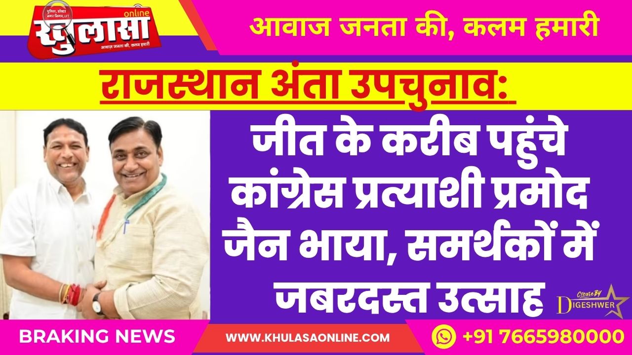 राजस्थान अंता उपचुनाव: जीत के करीब पहुंचे कांग्रेस प्रत्याशी प्रमोद जैन भाया, समर्थकों में जबरदस्त उत्साह