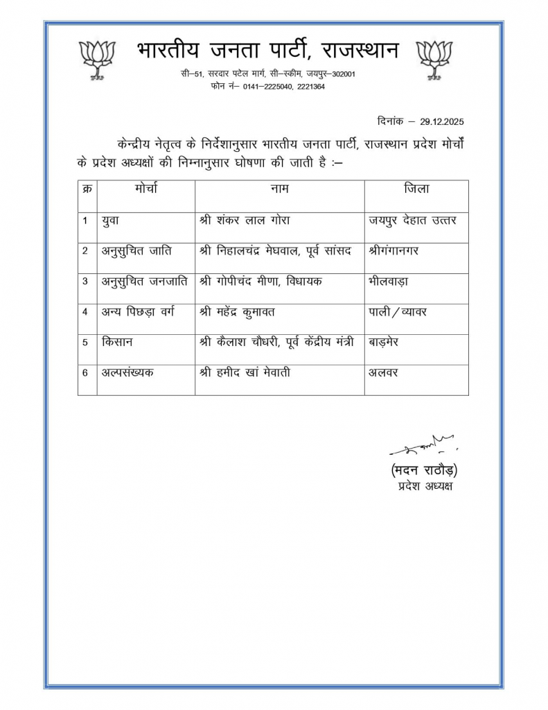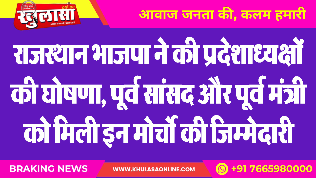 राजस्थान भाजपा ने की प्रदेशाध्यक्षों की घोषणा, पूर्व सांसद और पूर्व मंत्री को मिली इन मोर्चो की जिम्मेदारी