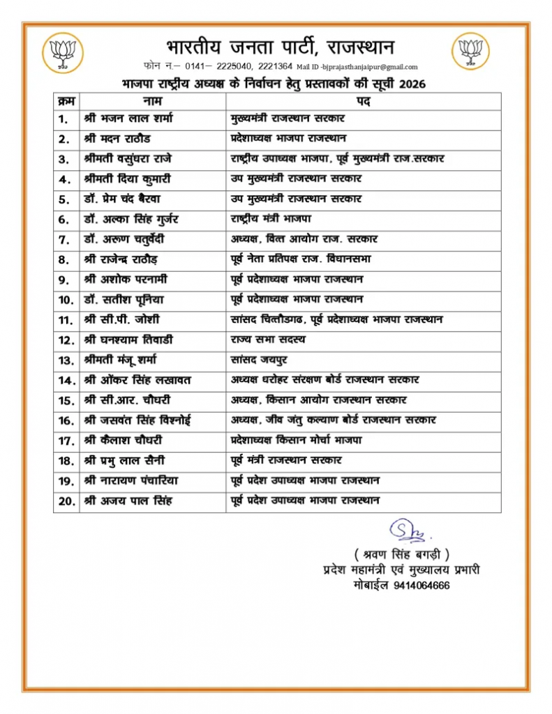जयपुर। भाजपा राष्ट्रीय अध्यक्ष चुनाव को लेकर हलचल तेज हो गई है। इसी क्रम में राजस्थान भाजपा ने राष्ट्रीय अध्यक्ष चुनाव के लिए प्रस्तावकों की लिस्ट जारी कर दी है। भाजपा राष्ट्रीय अध्यक्ष के चुनाव के लिए राजस्थान से 20 प्रस्तावक तय किए गए हैं।