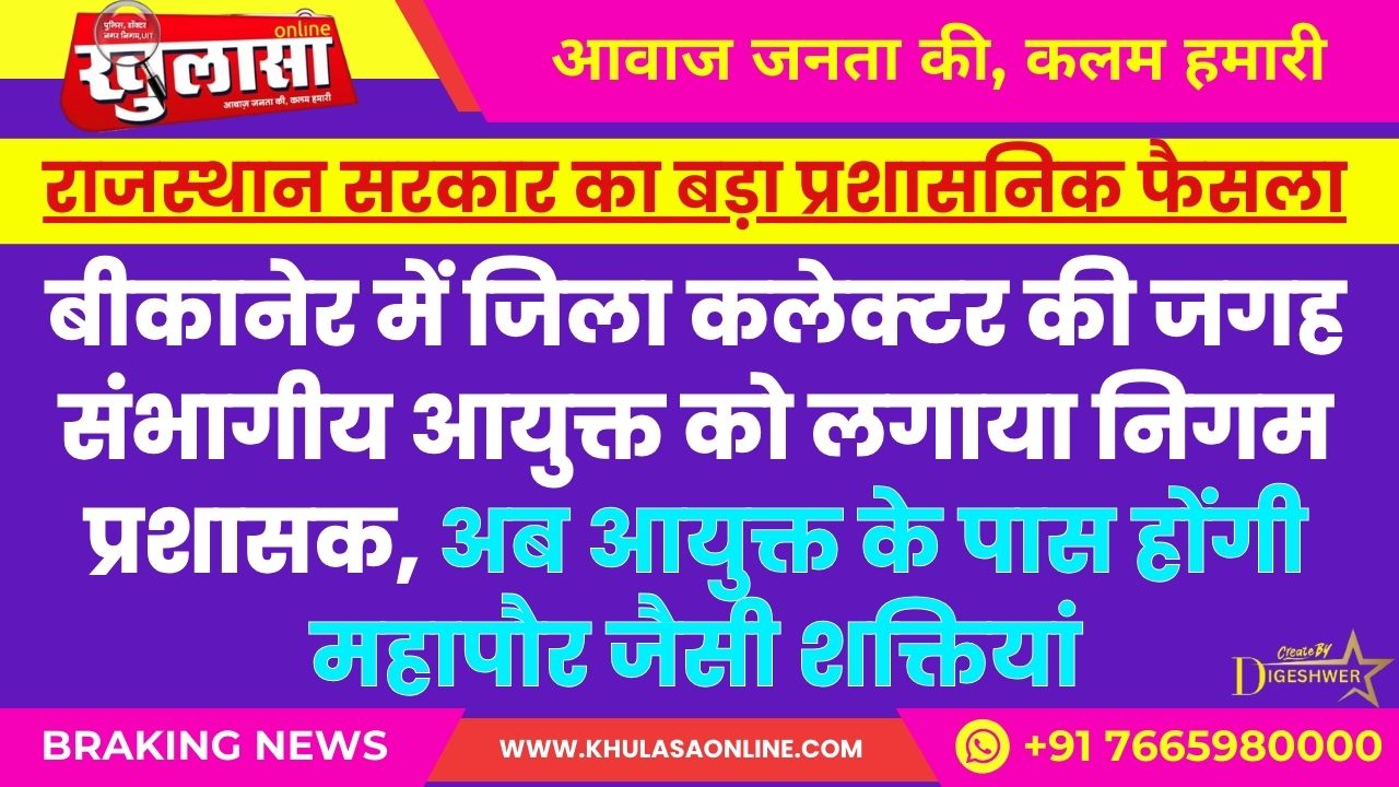 राजस्थान सरकार का बड़ा प्रशासनिक फैसला: बीकानेर में जिला कलेक्टर की जगह संभागीय आयुक्त को लगाया निगम प्रशासक, अब आयुक्त के पास होंगी महापौर जैसी शक्तियां