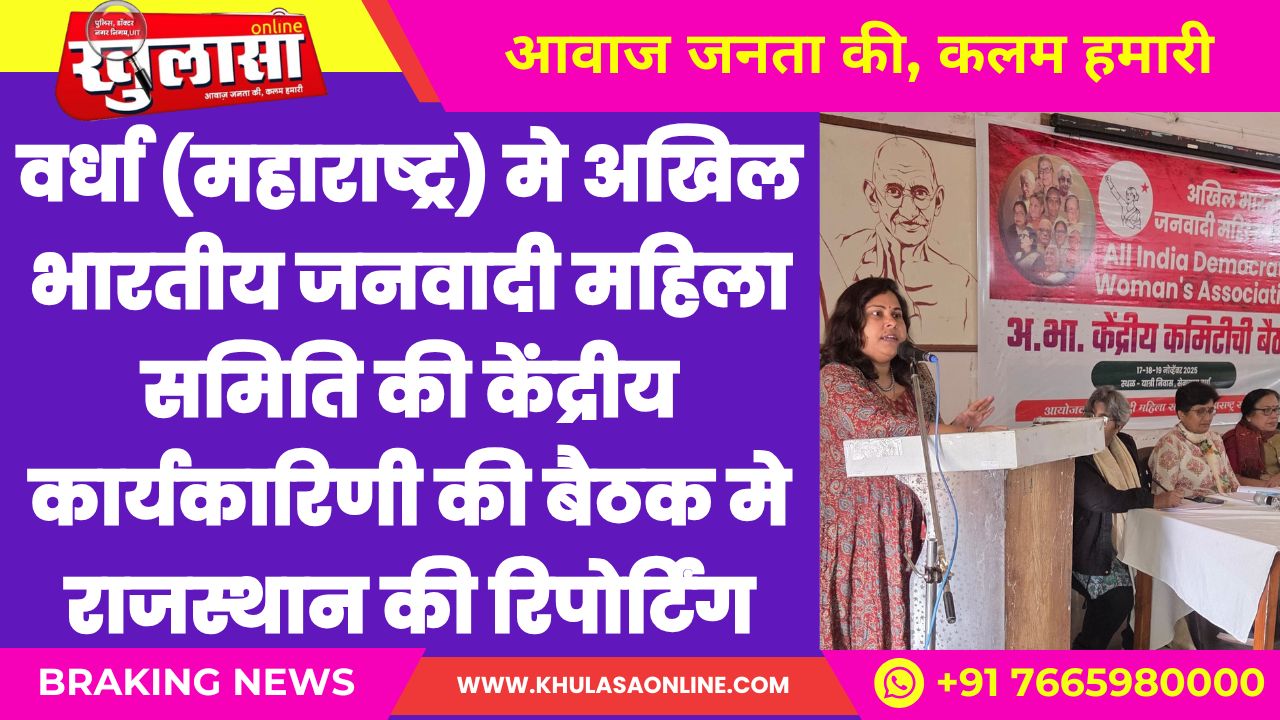 खुलासा न्यूज़। अखिल भारतीय जनवादी महिला समिति की केंद्रीय कमेटी की वर्धा (महाराष्ट्र) में तीन दिवसीय बैठक प्रारम्भ हुई। बैठक में देशभर से आई महिला प्रतिनिधियों ने भाग लिया। राजस्थान से प्रदेश महासचिव डॉ. सीमा जैन भी शामिल हुई और राज्य की महिलाओं से जुड़े मुद्दों पर विस्तृत रिपोर्ट प्रस्तुत की। बैठक में महिलाओं के सामने बढ़ते सामाजिक-आर्थिक, राजनीतिक और सांस्कृतिक हमलों की समीक्षा की गई। समिति ने कहा कि आज देश में महिलाओं के अधिकारों पर लगातार चोट की जा रही है, महंगाई, बेरोज़गारी और मजदूर-किसान विरोधी नीतियों का सबसे अधिक असर महिलाओं पर पड़ रहा है। खाद्य सुरक्षा, पोषण योजनाओं, आशा-आंगनवाड़ी-मिड डे मील कर्मियों के अधिकारों में भारी कटौती की जा रही है। महिलाओं के खिलाफ हिंसा लगातार बढ़ रही है, परंतु सरकारें सुरक्षा व न्याय सुनिश्चित करने में विफल हैं।