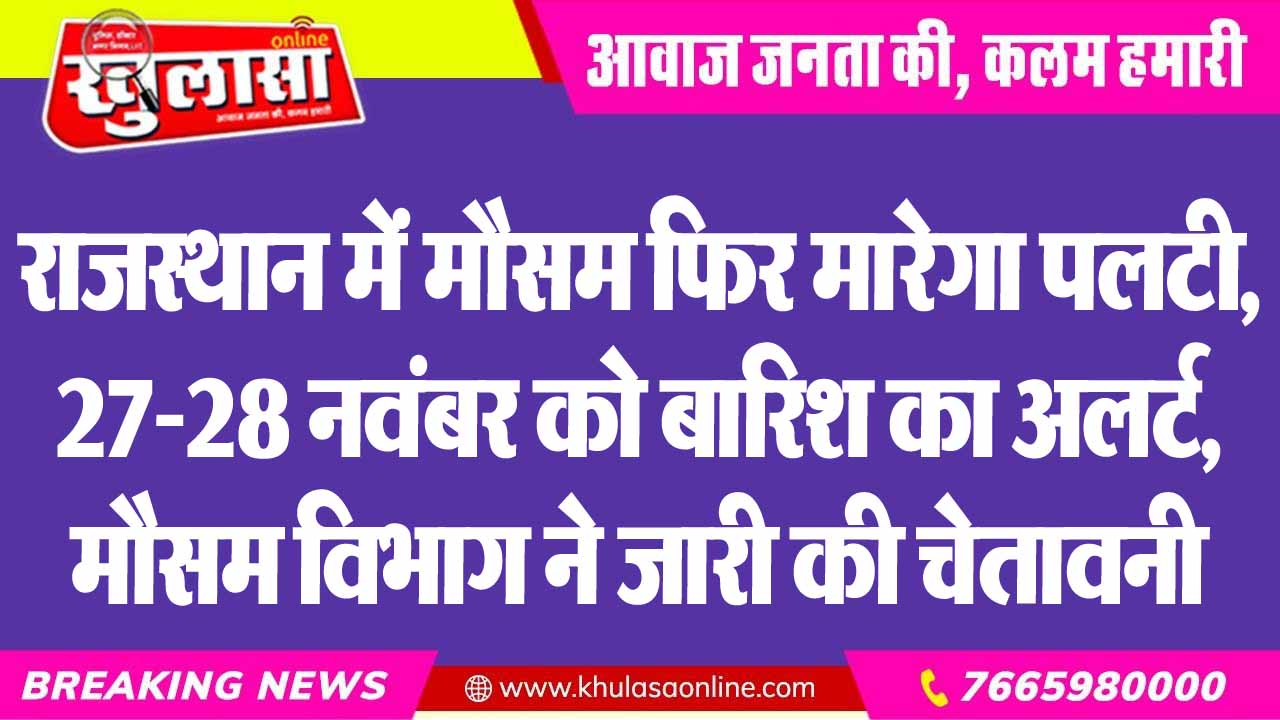 राजस्थान में मौसम फिर मारेगा पलटी, 27-28 नवंबर को बारिश का अलर्ट, मौसम विभाग ने जारी की चेतावनी