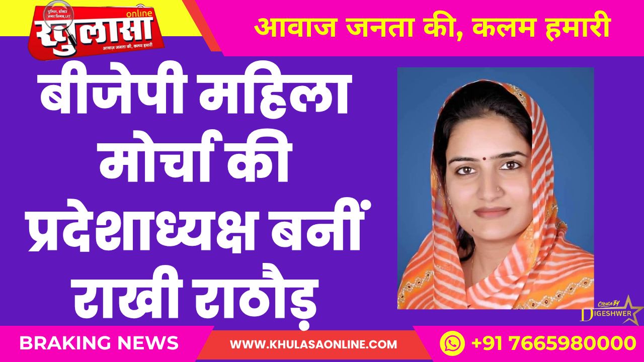 खुलासा न्यूज़। बीजेपी ने पूर्व पार्षद और वर्तमान में प्रदेश प्रवक्ता राखी राठौड़ को महिला मोर्चा की जिम्मेदारी सौंपी गई है। मदन राठौड़ ने राखी राठौड़ को भाजपा महिला मोर्चा की प्रदेश अध्यक्ष नियुक्त किया है। यह पद निवर्तमान प्रदेश अध्यक्ष रक्षा भंडारी के सिरोही जिला अध्यक्ष बनने के बाद से खाली चल रहा था। तीन दिन पहले बीजेपी ने 6 मोर्चों के अध्यक्षों की घोषणा की थी, लेकिन उस समय महिला मोर्चा अध्यक्ष की घोषणा नहीं हुई थी। आज पार्टी ने राखी राठौड़ को महिला मोर्चा की जिम्मेदारी सौंप दी है।