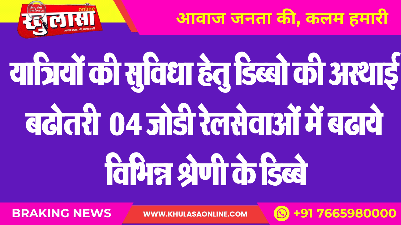 यात्रियों की सुविधा हेतु डिब्बो की अस्थाई बढोतरी 04 जोडी रेलसेवाओं में बढाये विभिन्न श्रेणी के डिब्बे