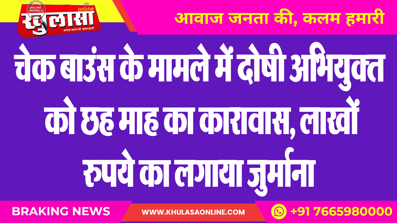 चेक बाउंस के मामले में दोषी अभियुक्त को छह माह का कारावास, लाखों रुपये का लगाया जुर्माना