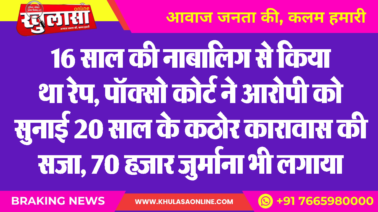 16 साल की नाबालिग से किया था रेप, पॉक्सो कोर्ट ने आरोपी को सुनाई 20 साल के कठोर कारावास की सजा, 70 हजार जुर्माना भी लगाया