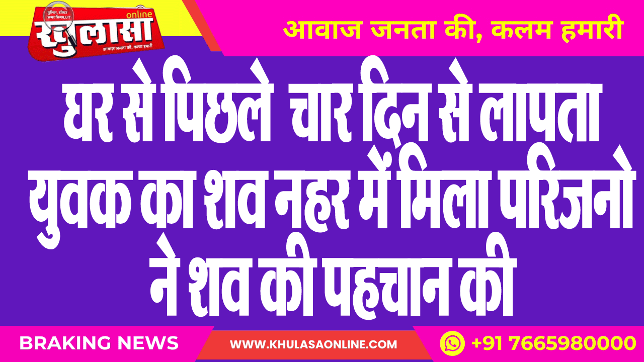घर से पिछले चार दिन से लापता युवक का शव नहर में मिला परिजनो ने शव की पहचान की