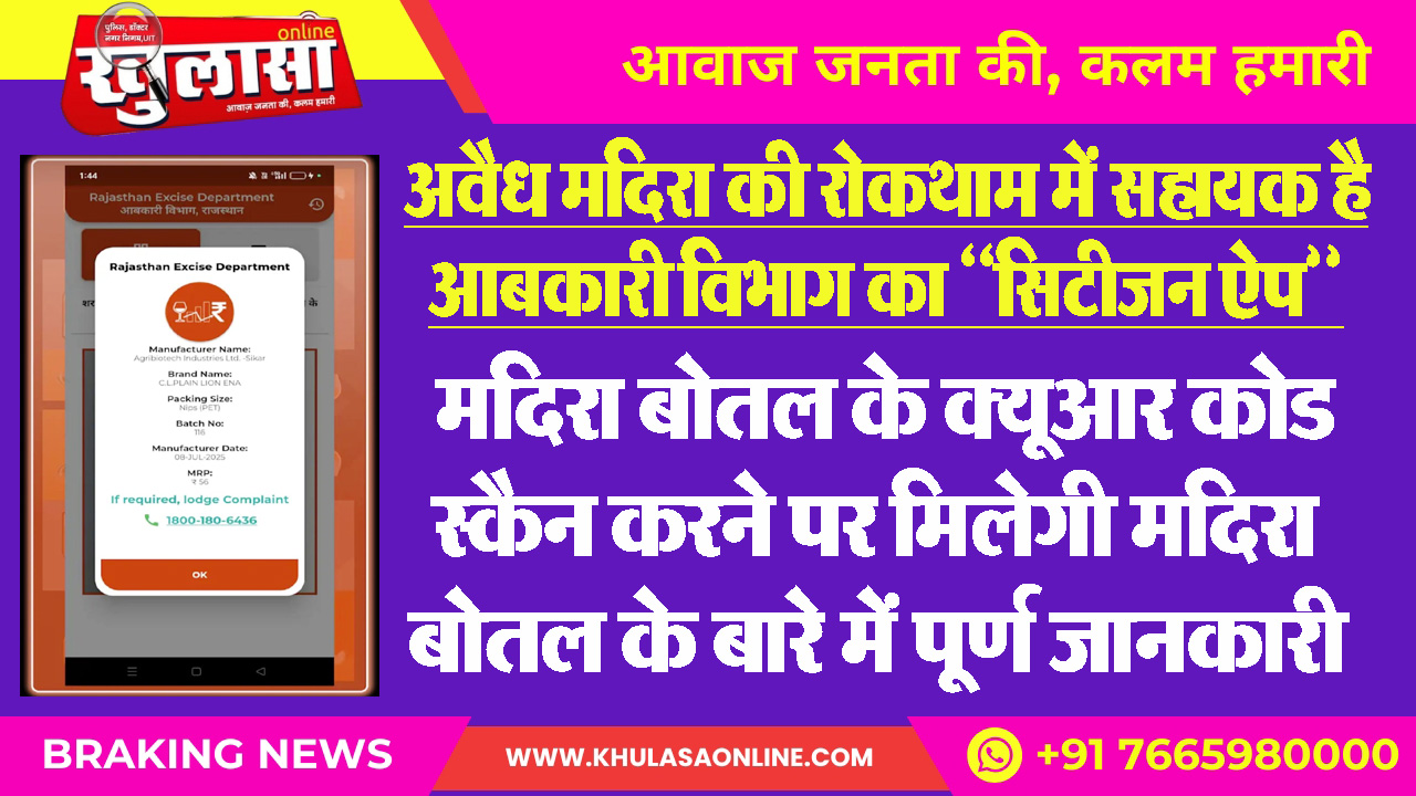 बीकानेर, 30 दिसंबर। प्रदेश में अवैध मदिरा के विक्रय की रोकथाम एवं हानिकारक मदिरा के दुष्प्रभावों से बचाव के लिए आबकारी विभाग का मदिरा की बोतल पर लगे होलोग्राम स्टीकर की जांच पर आधारित ‘‘सिटीजन ऐप’’ काफी उपयोगी है और अब गूगल प्ले स्टोर पर भी उपलब्ध है। इस ऑनलाईन ऐप के माध्यम से मदिरा बोतल के संबंध में पूर्ण सूचना मदिरा क्रेता अथवा उपयोगकर्ता को रियल टाइम में प्राप्त हो जाती है।