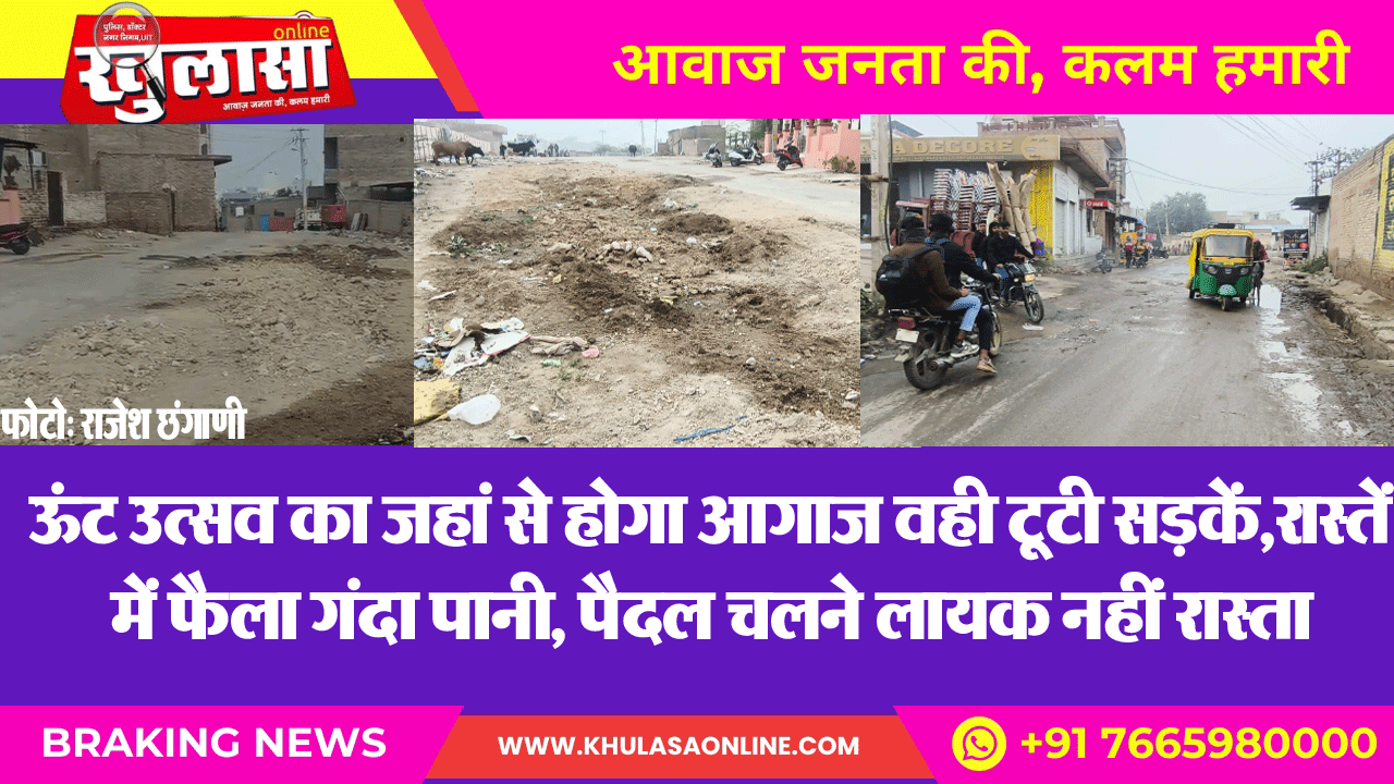 बीकानेर। अंतराष्ट्रीय ऊंट उत्सव को लेकर प्रशासन बड़े बड़े दावे कर रहा हे लेकिन हकीकत कुछ ओर ही सामने आ रही है। प्रशासन ने ऊंट उत्सव का भव्य आयोजन को लेकर बड़े दावे कर रहा है कि शहर की सडक़ें व रास्तों को पूर तरह से सही कर दिये है आमजन के लिए राहत होगी। इसी को लेकर खुलासा न्यूज ने आगाज से लेकर हैरिटेज लुक तक का जायजा लिया तो हकीकत सामने ऐसी आई कि शर्मसार होना पड़ा। जहां से ऊंट उत्सव का आगाज होगा वो रास्ता टूट पड़ा है पूरी सडक़ टूटी हुई गंदा पानीपूरी सडक़ पर फैला हुआ दिखाई दे रहा था। पैदल तक चलना मुश्किल हो रहा है। जबकि इस ऊंट उत्सव में प्रशासन लाखों रुपयेइन सडक़ों व हैरिटेज लुक को दुरुस्त करने की बात करता है। रात को इन्हें रास्तों पर अंधेरा छाया रहता है। हर समय बड़ी वारदातहोने की संभावना रहती है। नत्थुसर गेट से लेकर धनीधर मंदिर तक सडक़ जगह जगह क्षतिग्रस्त हो रखी है। हरलोई हनुमान मंदिरके आगे तो गंदा पानी 24 घंटे भरा रहता है और साथ गायों का गोबर भी सडक़ों पर फैला रहता है। क्योकि आस पास सडक़ केआमजन द्वारा गायों के बाड़े बना रखे है। वहीं लक्ष्मीनाथ मंदिर तक धनीधर ग्राउण्ड तक की सडक़ भी पूरी तरह से टूटी हुई पड़ी हैऔर शीतला गेट के पास कचरे का ढेर व गंदा पानी हर समय जमा रहता है। इस हालात में ऊंट उत्सव करना कितना सार्थक है।