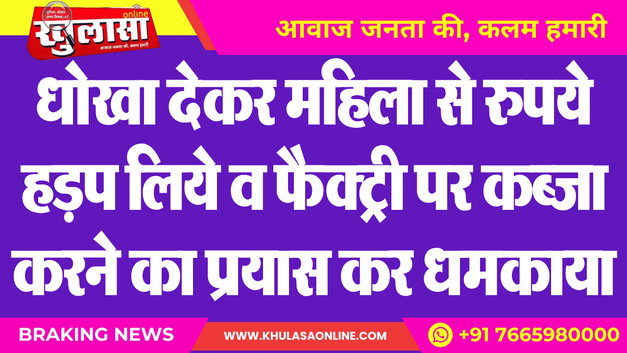 धोखा देकर महिला से रुपये हड़प लिये व फैक्ट्री पर कब्जा करने का प्रयास कर धमकाया