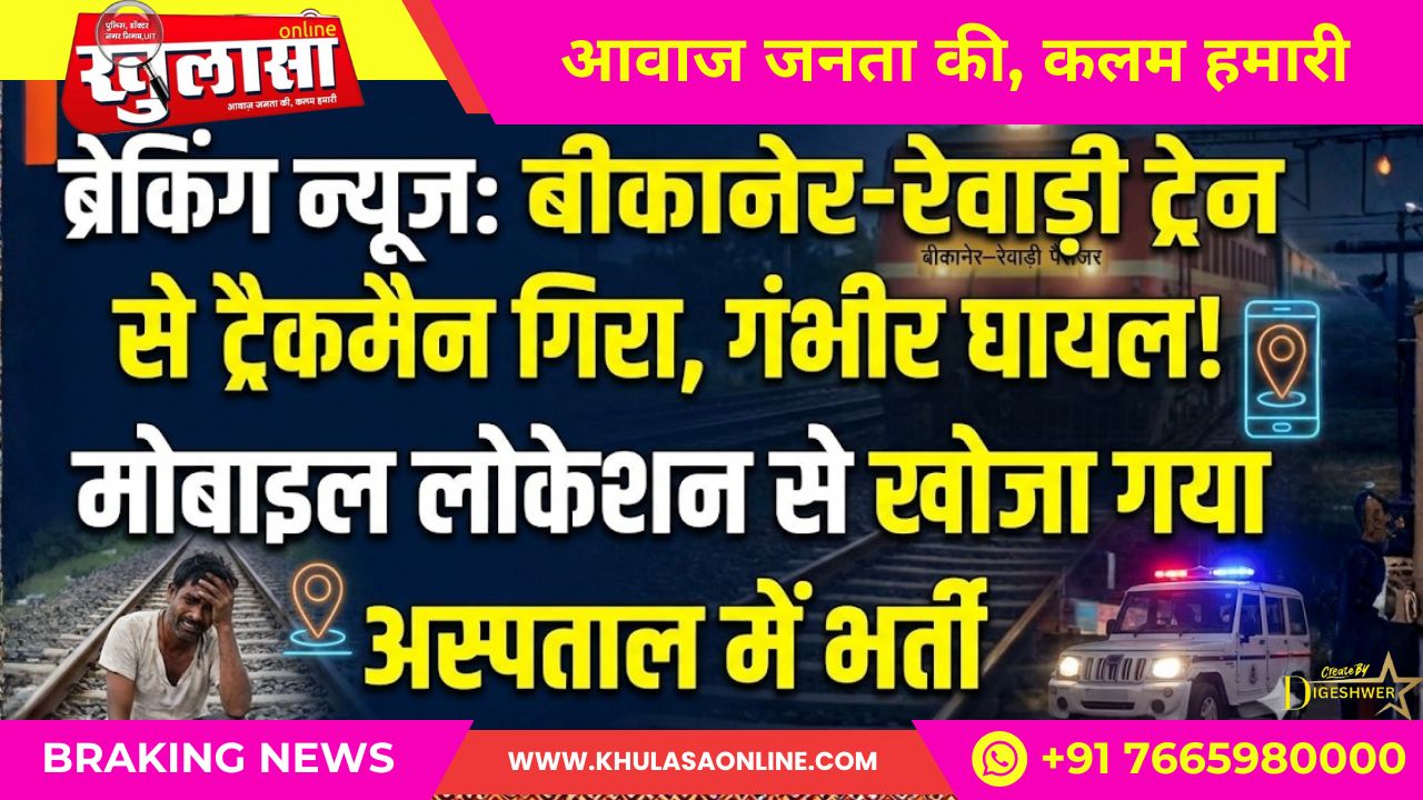 खुलासा न्यूज़, बीकानेर। बीकानेर–रेवाड़ी पैसेंजर ट्रेन से मंगलवार को एक रेलवे ट्रैकमैन चलती ट्रेन से गिर गया, जिससे वह गंभीर रूप से घायल हो गया। हादसा जुहारपुरा और देपालसर स्टेशन के बीच हुआ। घायल ट्रैकमैन को मोबाइल लोकेशन के आधार पर ढूंढकर चूरू के डीबी अस्पताल में भर्ती कराया गया, जहां उसका इलाज जारी है। जानकारी के अनुसार, ट्रैकमैन राकेश कुमार, निवासी खीलवता, महेंद्रगढ़ (हरियाणा), महेंद्रगढ़ रेलवे में ट्रैकमैन के पद पर कार्यरत है। वह अपने दो साथियों के साथ रेलवे का सामान लेने बीकानेर आया था। बीकानेर से सामान लेकर तीनों बीकानेर–रेवाड़ी पैसेंजर ट्रेन से लौट रहे थे।