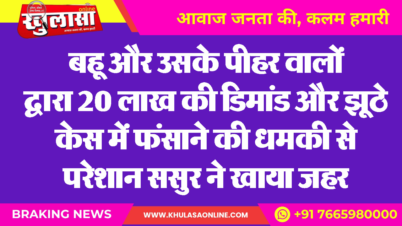 बहू और उसके पीहर वालों द्वारा 20 लाख की डिमांड और झूठे केस में फंसाने की धमकी से परेशान ससुर ने खाया जहर