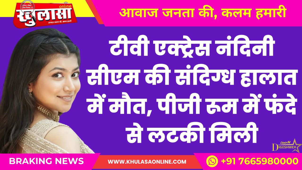 खुलासा न्यूज़। टेलीविजन इंडस्ट्री से जुड़ी 26 वर्षीय अभिनेत्री नंदिनी सीएम की बेंगलुरु के केंगेरी इलाके में संदिग्ध हालात में मौत हो गई। नंदिनी का शव एक पेइंग गेस्ट (PG) आवास के कमरे में फंदे से लटका मिला।पुलिस के अनुसार घटना 28 दिसंबर 2025 की रात करीब 11:16 बजे से 29 दिसंबर 2025 की रात 12:30 बजे के बीच की बताई जा रही है। घटना की सूचना 29 दिसंबर की सुबह करीब 9:15 बजे पुलिस को मिली। नंदिनी केंगेरी स्थित पीजी की दूसरी मंजिल पर रह रही थीं।