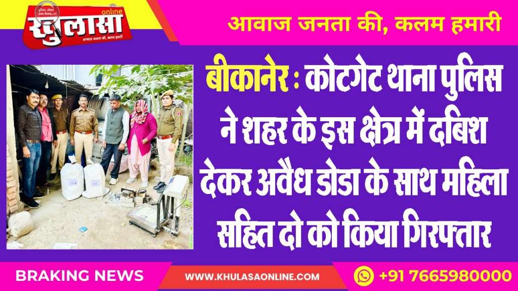 खुलासा न्यूज, बीकानेर। अवैध मादक पदार्थ के खिलाफ पुलिस ने कार्रवाई करते हुए दो आरोपियों को गिरफ्तार किया है। यह कार्रवाई छत्तरगढ़ पुलिस ने की है। पुलिस ने आईजी और एसपी बीकानेर के निर्देशों पर यह कार्रवाई की है। जिसमें पुलिस ने गश्त के दौरान एक संदिग्ध बोलेरो को रूकवाकर तलाशी ली। तलाशी के दौरान गाड़ी में मौजूद दोनों व्यक्तियों के पास से 100 ग्राम अवैध अफीम मिली। जिस पर पुलिस ने गाड़ी में सवार बज्जू कस्बे के गौडू निवासी राजेश थापन और चक 03 पीएसएसएम रणजीतपुरा निवासी मनोज कुमार को गिरफ्तार किया है। पुलिस ने दोनों के खिलाफ एनडीपीएस एक्ट के तहत मामला दर्ज कर बोलेरो गाड़ी को जब्त कर लिया है।