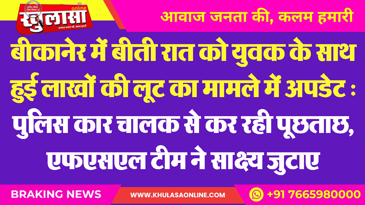 बीकानेर में बीती रात को युवक के साथ हुई लाखों की लूट का मामले में अपडेट : पुलिस कार चालक से कर रही पूछताछ, एफएसएल टीम ने साक्ष्य जुटाए