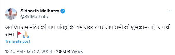 इसके अलावा बॉलीवुड के ‘योद्धा’ सिद्धार्थ मल्होत्रा ने सभी को शुभकामनाएं देते हुए लिखा, “अयोध्या राम मंदिर की प्राण प्रतिष्ठा के शुभ अवसर पर आप सभी को शुभकामनाएं। जय श्री राम”।
