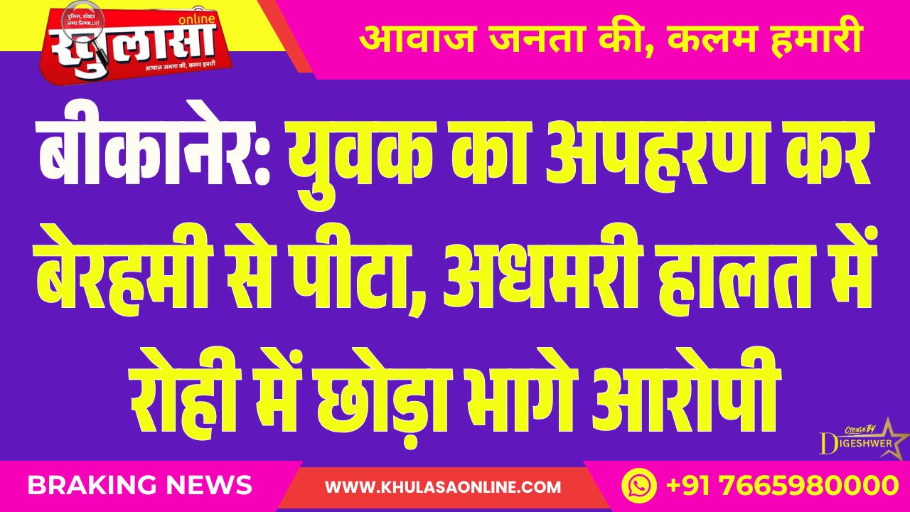 खुलासा न्यूज़, बीकानेर। देशनोक थाना क्षेत्र में अपहरण कर युवक के साथ बेरहमी से मारपीट करने का सनसनीखेज मामला सामने आया है। घटना 29 नवंबर की रात सवा नौ बजे से लेकर 30 नवंबर की सुबह छह बजे के बीच की बताई जा रही है।